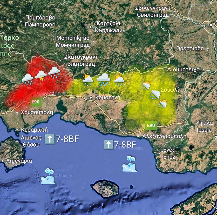 3. 💨 Ισχυροί Άνεμοι στο Θρακικό Πέλαγος. Ένα ακόμα χαρακτηριστικό φαινόμενο για αύριο Πέμπτη θα είναι οι πολύ ισχυροί νότιαδες. Οι άνεμοι στο Θρακικό Πέλαγος θα φτάσουν τα 7 με 8 Μποφόρ (BF), ενώ και στην ηπειρωτική Θράκη περιμένουμε ισχυρούς ανέμους εντάσεως έως 7Bf.