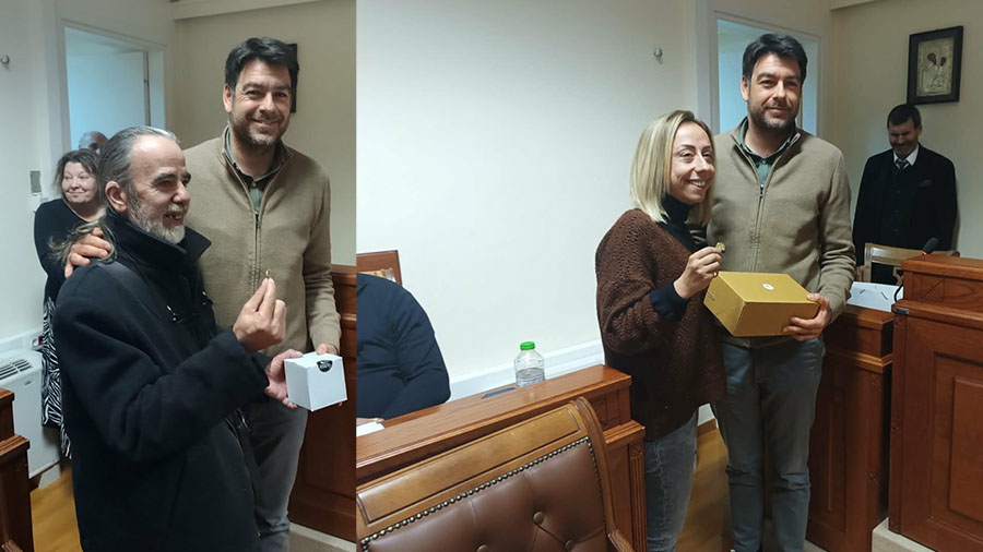 Το φλουρί από τις βασιλόπιτες έτυχαν η Αντιπρόεδρος της ΔΕΥΑΞ Ελισάβετ Παυλίδου και ο Σάκης Βουτσαδάκης για να παραλάβουν ένα μικρό δώρο από τον Δήμαρχο Ξάνθης Ευστράτιο Κοντό.