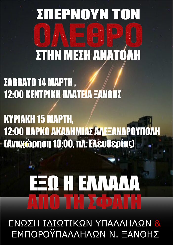 H Ένωση Ιδιωτικών Υπαλλήλων και Εμποροϋπαλλήλων Ξάνθης, καλεί το Σάββατο 14 Μαρτίου τους πολίτες, σε αντιπολεμική συγκέντρωση στην κεντρική πλατεία της Ξάνθης, με κεντρικό μήνυμα “Έξω η Ελλάδα από την σφαγή”.