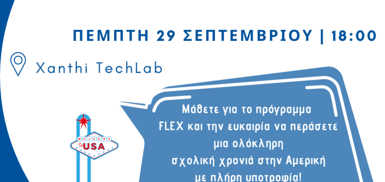 Xanthi Tech Lab: “Eκδήλωση για το διαγωνισμό συμμετοχής στο Πρόγραμμα Μαθητικής Ανταλλαγής Future Leaders Exchange (FLEX)”. 21 Σεπτεμβρίου, 2022